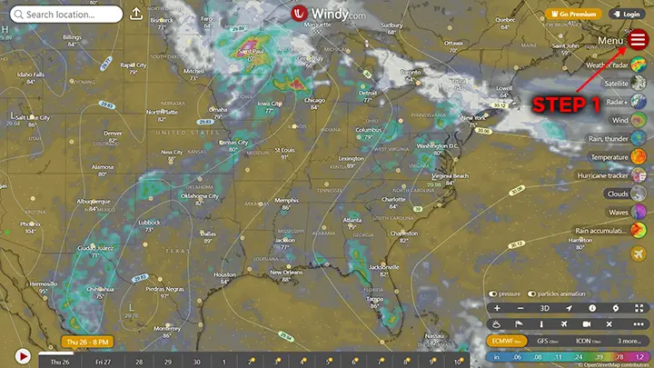 1. Go to Windy.com. Click Menu