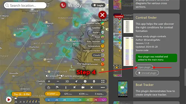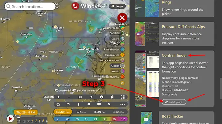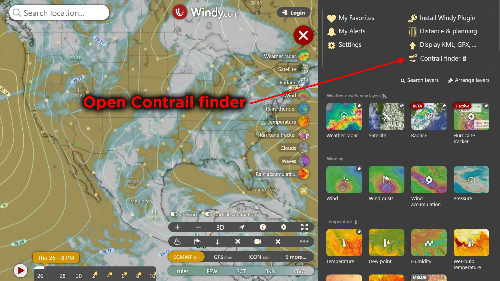 After returning to Windy.com with the link above, click Menu and click “Contrail finder” at the top of the menu to launch the plugin again.